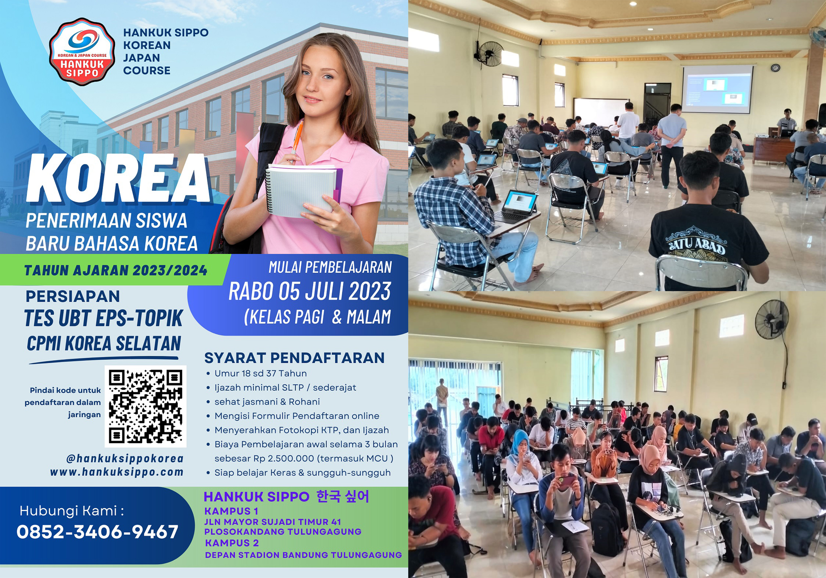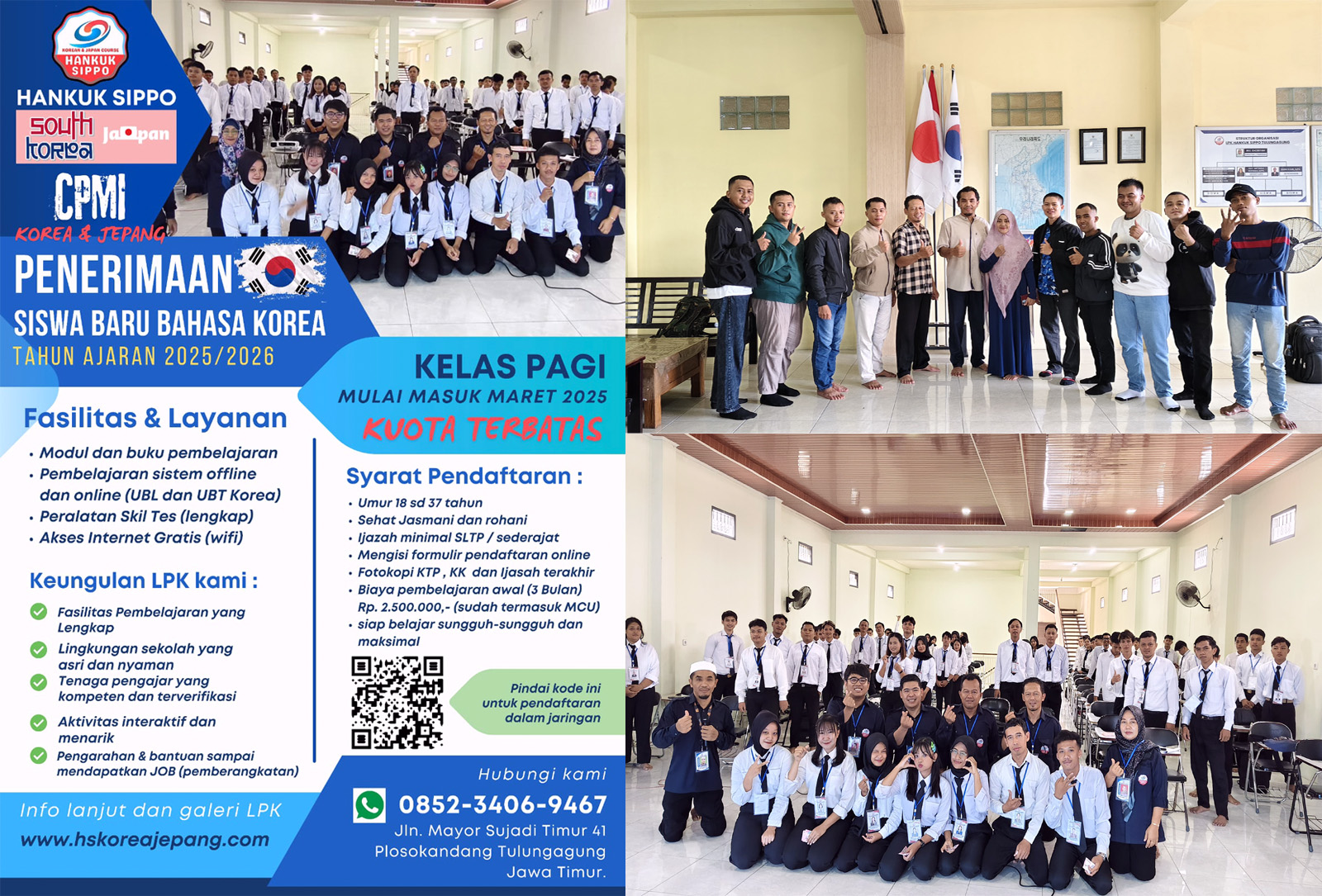 Kami LPK HANKUK SIPPO KOREA (TULUNGAGUNG) membuka Pendaftaran Siswa Baru Tahun ajaran thn 2025/2026 , Mulai Masuk Bulan Maret tahun 2025 untuk program khusus Bahasa Korea persiapan ujian EPS-TOPIK UBT dan Bahasa Jepang untuk Calon Pekerja Migran Indonesia (CPMI) dengan sistem Pembelajaran OFFLINE (TATAP MUKA)  . Lulus Tes Bahasa Korea merupakan syarat mutlak CPMI untuk bisa melamar pekerjaan ke negara KOREA SELATAN. Untuk itu kami hadir di tengah Masyarakat untuk membimbing dan mengajar dengan sepenuh hati dengan harapan agar semua anak didik kami mampu berbahasa korea dengan baik dan selanjutnya mampu dan LULUS UJIAN BAHASA KOREA dengan hasil yang memuaskan. Karena persaingan dan sekian banyaknya peminat dan peserta Ujian setiap tahunnya, Kata LULUS merupakan hal yang selalu di harapkan. Hanya dengan persiapan belajar  lebih awal dan cukup waktu merupakan hal terbaik dilakukan.
