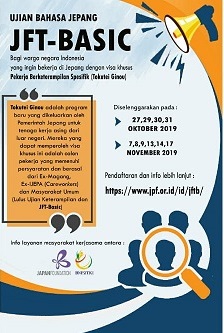 Japan Foundation di Jakarta telah membuka pendaftaran untuk mengikuti ujian JFT-Basic dan mengundang warga negara Indonesia yang memenuhi persyaratan dan berminat bekerja ke Jepang untuk mendaftar. Untuk informasi lebih lanjut mengenai JFT-Basic dan melakukan pendaftaran dapat dilakukan melalui situs>>>>>> https://www.jpf.or.id/id/jftb/ *** (Humas)